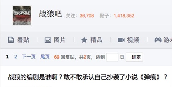 2015年《战狼》出来时有网友在贴吧里嚷道:“《战狼》的编剧是谁啊?敢不敢承认自己抄袭了小说《弹痕》?”