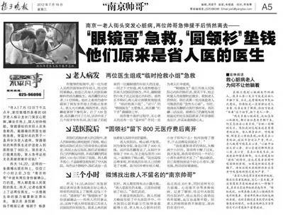 2012年7月13日下午五点半,家住南京鼓楼四条巷的68岁杨老出门突发心脏病,瘫坐在地上,大汗淋漓,喘得厉害,这时,一个穿圆领衫的年轻人买来急救药,戴眼镜的男医生就地急救,还有一位蓝衬衫一直为老人遮雨。这一幕被路人拍了下来。