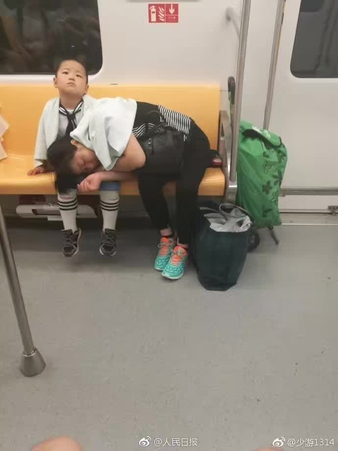 小男孩的妈妈困了,趴在他的腿上,小男孩不时拍拍妈妈,怕坐过站,每到一站时就告诉妈妈到哪站了。