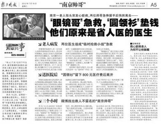 2012年7月13日下午五点半,家住南京鼓楼四条巷的68岁杨老出门突发心脏病,瘫坐在地上,大汗淋漓,喘得厉害,这时,一个穿圆领衫的年轻人买来急救药,戴眼镜的男医生就地急救,还有一位蓝衬衫一直为老人遮雨。这一幕被路人拍了下来。