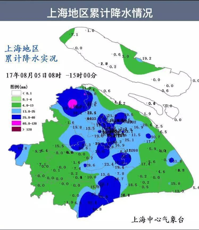 强对流天气下的降水并不均匀,崇明累积雨量仅1毫米,中心城区(徐家汇站)为15.3毫米。