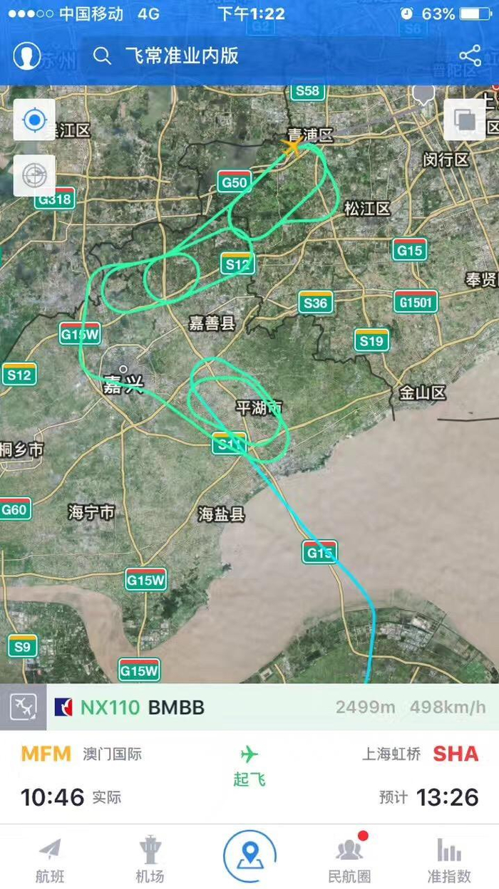一名从澳门回沪的网友发现,出于安全考量,自己乘坐的航班愣是在天上兜了好几个圈子才最终降落。
