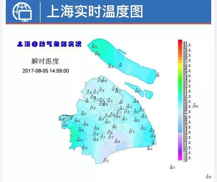 下午时分本应是全天气温最高时段,但是今天下午14时30分,申城气温普遍在27至28℃,比早晨的温度还低,在室外的行人可以感受到难得的清凉。