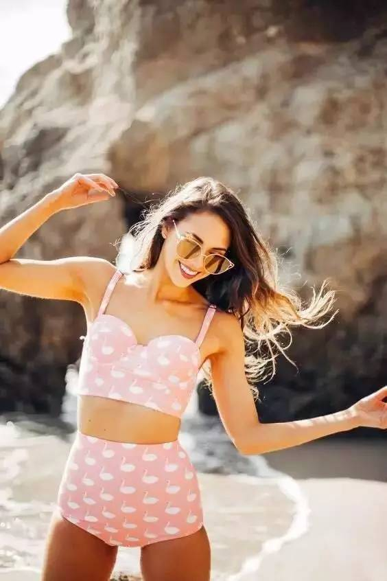 如果还是喜欢two pieces的设计,千万记得选这种高腰的款式,这样不仅能保证露出你全身躯体最细的部分,还能稍微遮一遮小肚腩哦~