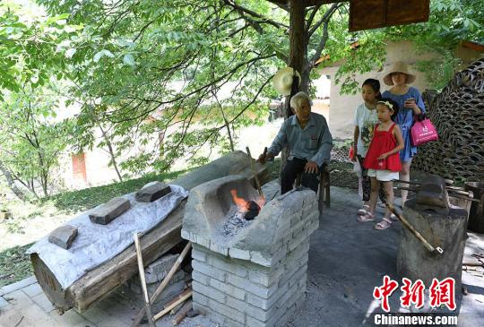 图为康县岸门口镇街道村朱家沟社,在这个旅游村里,有一个简易铁匠铺,老人在这里打铁。 杨艳敏 摄