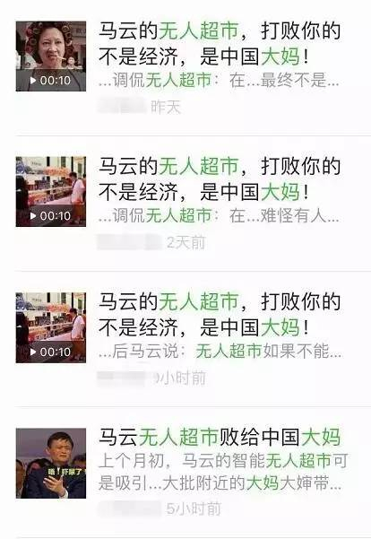 这些帖子标题大同小异:《避暑大妈占领无人超市 想颠覆零售业的马云却被大妈们颠覆了》《马云在杭州开的全中国第一家无人超市,没败在逃款上,却败在中国大妈蹭空调上》,说的也是同一件事——大意是由于天气炎热,一群大妈跑进马云在杭州的无人超市避暑,这些帖子中或配视频或配图,显示一大群大妈在一家貌似超市的地方席地而座聊家常,几乎把超市围个水泄不通。