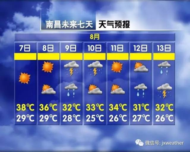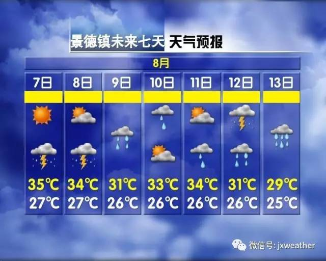今天晚上九江、景德镇两市和上饶市北部晴天间多云,部分午后到夜间有阵雨或雷阵雨;全省其他地区晴天多云,局部午后到夜间有阵雨或雷阵雨。