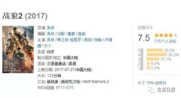 《战狼2》无论是从票房还是从口碑上来看,无疑都是成功的,上映5天,票房15.59亿元人民币,单日票房过4亿元,豆瓣评分7.5分,