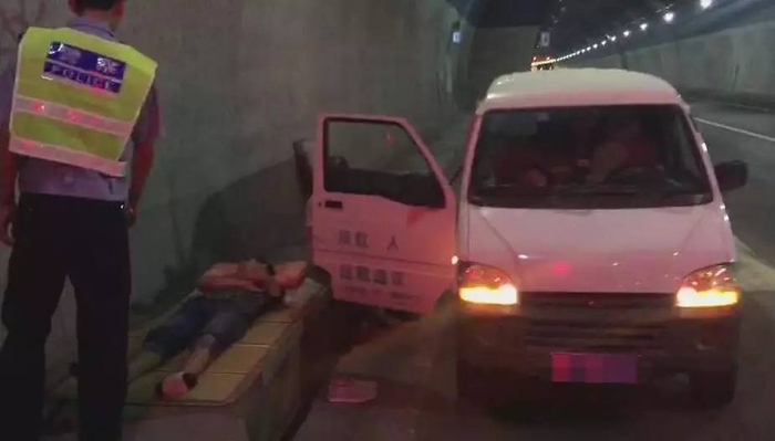 8月6日下午14点30分许,高速江口大队执行巡逻任务时,接监控中心电话称:一男子在隧道里铺席睡觉,民警立刻赶往杭瑞高速363KM+500M思南往铜仁方向江口隧道,发现一辆贵C牌照的白色面包车停在隧道内应急车道内。