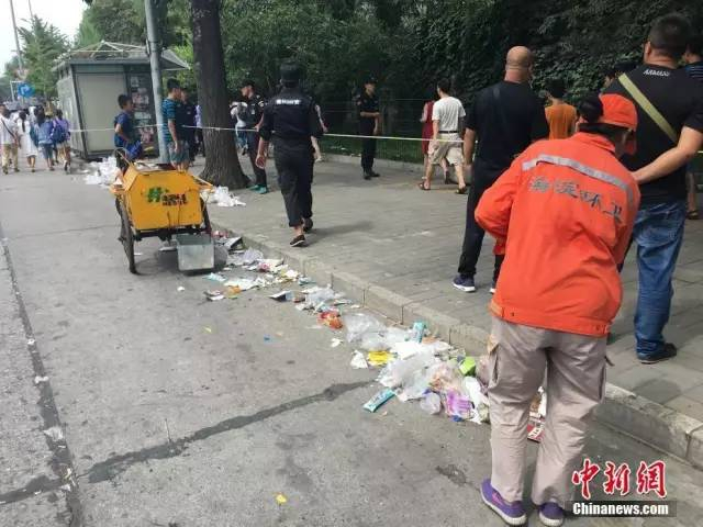 附近环卫工表示,暑假以来,大量的游客排队进校参观,每天都有很多垃圾。中新网记者 汤琪 摄