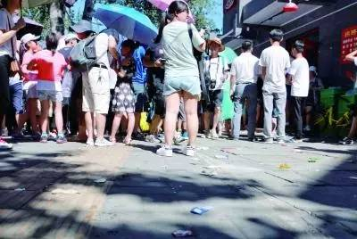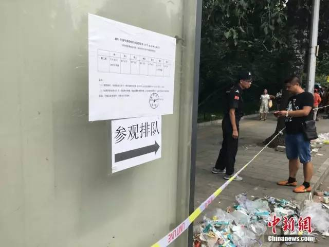 在排队现场,参观队伍长达百米,排队人群滞留下的饭盒、空水瓶、纸巾等垃圾遍地。