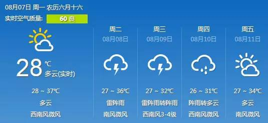 今明两天,我市也会下雨,但以午后局部地区阵雨或雷雨为主。周三周四,我市转为阴有阵雨或雷雨,最高气温随之下降到31-32℃。究其背后的原因,是因为北方有冷空气活跃。周五开始到周日,天气虽然有所好转,以多云天气为主,但最高气温在短期内不会有明显反弹,仍旧维持在高温线以下,最低可达31℃。