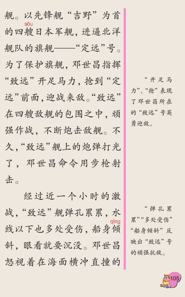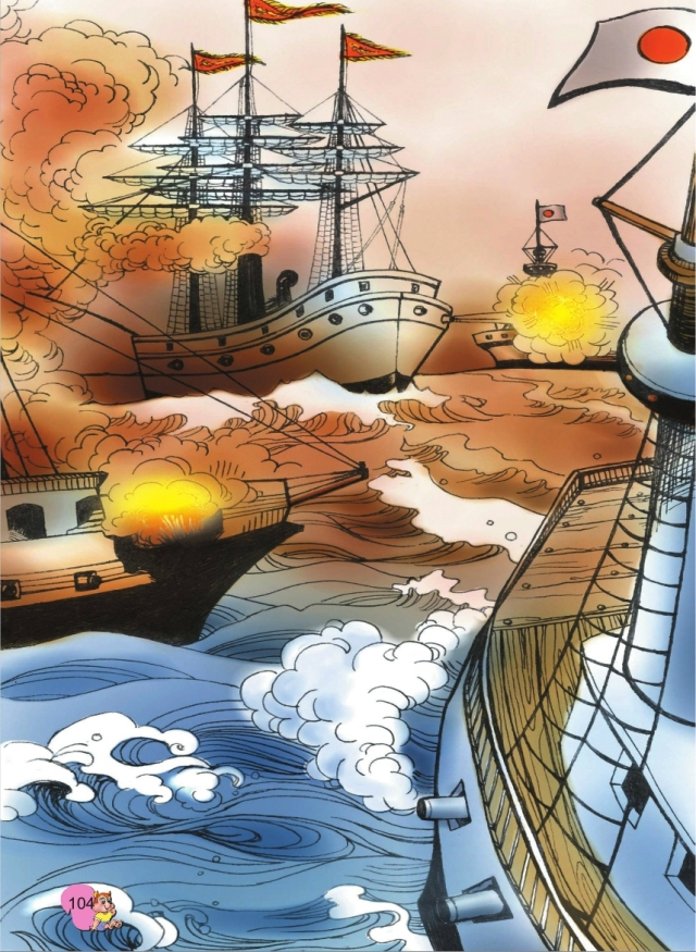 战中,担任指挥的旗舰被击伤,大旗被击落,邓世昌立即下令在自己的“致远”舰上升起旗帜,吸引住敌舰。他指挥的致远号在战斗中最英勇,前后火炮一齐开火,连连击中日舰。日舰包围过来,“致远”舰受了重伤,开始倾斜,炮弹也打光了。邓世昌感到最后时刻到了,他下令开足马力向日舰“吉野”号冲过去,要和它同归于尽。