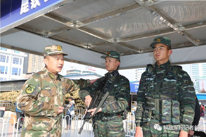 时任武警昆明支队支队长的方红霄(左一)在火车站指导春运安保工作(2016年2月8日 廖伟 摄)。
