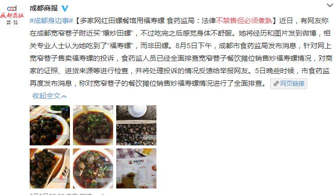 《成都商报》:多家网红田螺餐馆用福寿螺 食药监局:法律不禁售但必须煮熟
