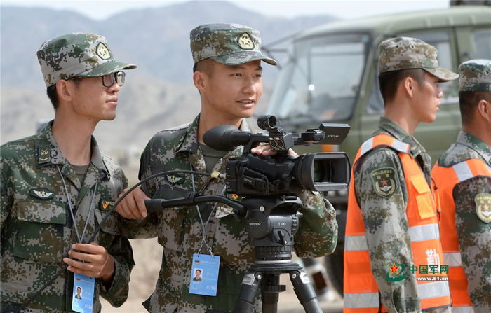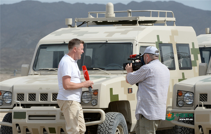 俄罗斯记者在比赛核心区拍摄中方提供的越野型防化侦察车。吴苏琳 摄影