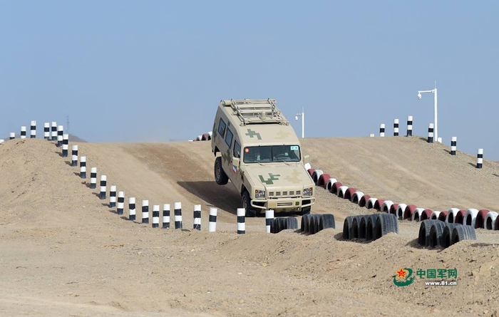 接力赛中,熟练驾驭中国勇士越野车的外军车组敢于高速通过土坡。吴苏琳 摄影