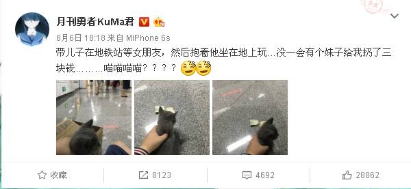 近日,网友@月刊勇者KuMa君 发微博称在地铁站等女朋友的时候,抱着自己的猫坐在地上玩,没一会儿有个妹子跑过来给他扔了三块钱……