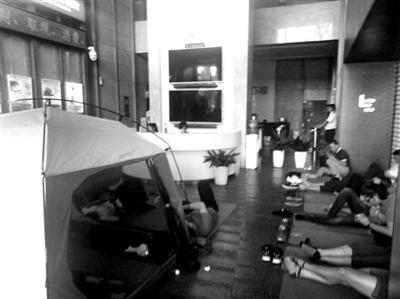 大厅服务台前,是二十来张瑜伽垫、野餐垫,两顶帐篷和二十来名讨债人。每天上午9点一直到晚7点左右,他们或者坐在小马扎上,或者躺在垫子上,实在累了就去帐篷里休息会儿。“老躺着腰疼。”讨债人涛涛说道。