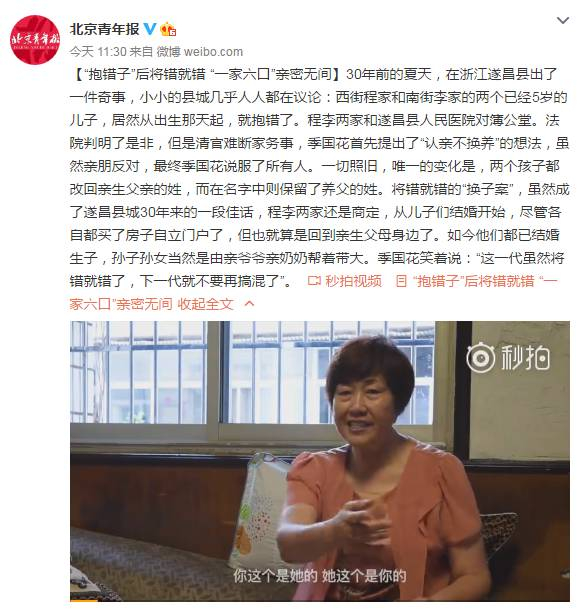 【“抱错子”后将错就错 “一家六口”亲密无间】30年前的夏天,在浙江遂昌县出了一件奇事,小小的县城几乎人人都在议论:西街程家和南街李家的两个已经5岁的儿子,居然从出生那天起,就抱错了。程李两家和遂昌县人民医院对簿公堂。法院判明了是非,但是清官难断家务事,季国花首先提出了“认亲不换养”的想法,虽然亲朋反对,最终季国花说服了所有人。一切照旧,唯一的变化是,两个孩子都改回亲生父亲的姓,而在名字中则保留了养父的姓。将错就错的“换子案”,虽然成了遂昌县城30年来的一段佳话,程李两家还是商定,从儿子们结婚开始,尽管各自都买了房子自立门户了,但也就算是回到亲生父母身边了。如今他们都已结婚生子,孙子孙女当然是由亲爷爷亲奶奶帮着带大。季国花笑着说:“这一代虽然将错就错了,下一代就不要再搞混了”。