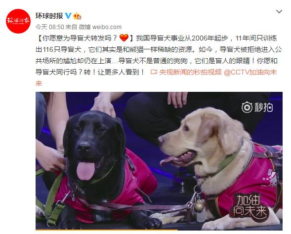 【你愿意为导盲犬转发吗?】我国导盲犬事业从2006年起步,11年间只训练出116只导盲犬,它们其实是和熊猫一样稀缺的资源。如今,导盲犬被拒绝进入公共场所的尴尬却仍在上演…导盲犬不是普通的狗狗,它们是盲人的眼睛!你愿和导盲犬同行吗?转!让更多人看到!