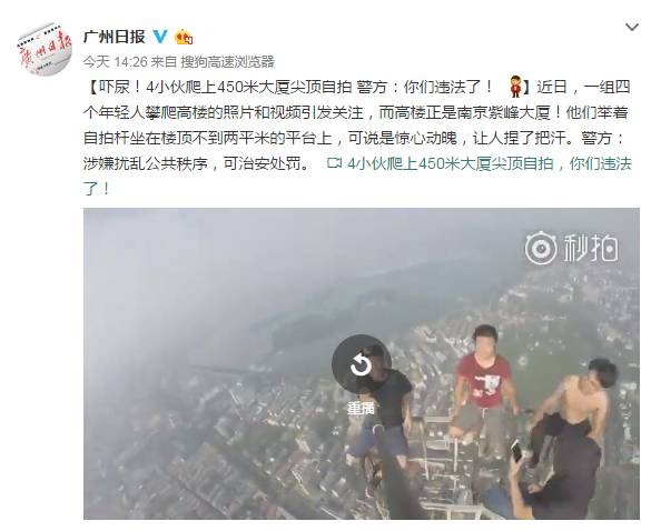 【吓尿!4小伙爬上450米大厦尖顶自拍 警方:你们违法了!】近日,一组四个年轻人攀爬高楼的照片和视频引发关注,而高楼正是南京紫峰大厦!他们举着自拍杆坐在楼顶不到两平米的平台上,可说是惊心动魄,让人捏了把汗。警方:涉嫌扰乱公共秩序,可治安处罚。