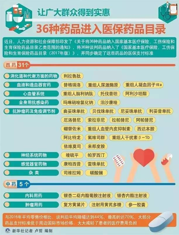 ▶人社部日前公布36种药品进入医保目录后的价格谈判结果,原价两万多一支的抗癌药赫赛汀降到7600元,多种进口药品价格均不同程度下降。