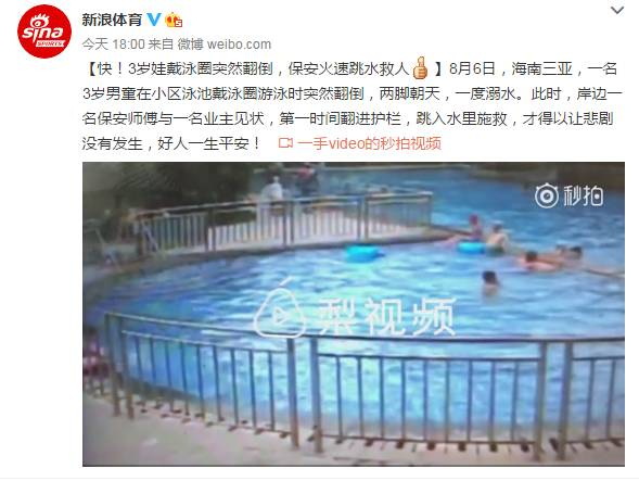 【快!3岁娃戴泳圈突然翻倒,保安火速跳水救人】8月6日,海南三亚,一名3岁男童在小区泳池戴泳圈游泳时突然翻倒,两脚朝天,一度溺水。此时,岸边一名保安师傅与一名业主见状,第一时间翻进护栏,跳入水里施救,才得以让悲剧没有发生,好人一生平安!