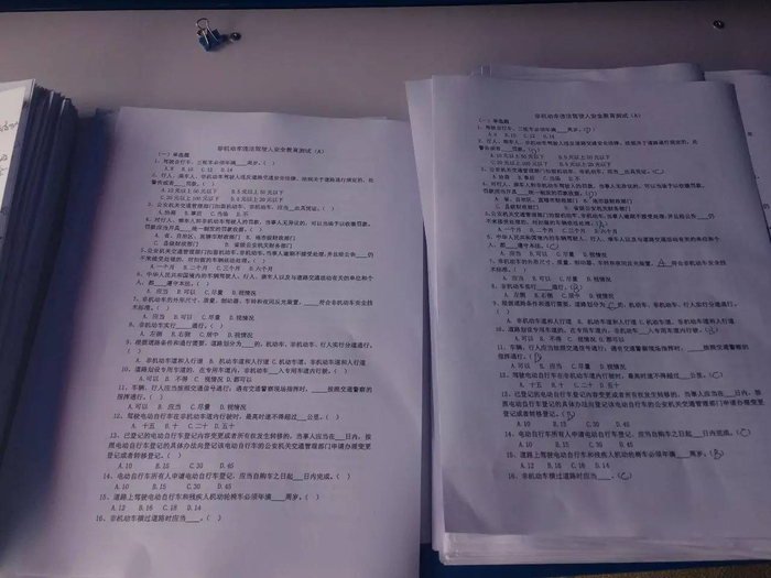 天天快递的严达领骑着电单车过来,他自己被货物前后包围,双腿只能叉开吊着。他不爱说话,按交警要求抄写交规,字写得飞快,10分钟抄了一页,又做题,7分钟完成。他说:"我要马上去送货,要把这17分钟抢回来。"