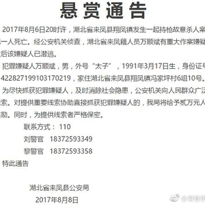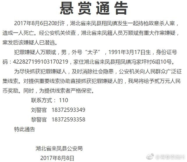 8月6日20时许,湖北省来凤县翔凤镇发生一起持枪故意杀人案,造成一人死亡。8月8日,来凤县公安局发布的悬赏通告显示,来凤籍人员万某有重大作案嫌疑,悬赏贰万元。8月8日17时,参与该案件的刘警官告诉澎湃新闻(www.thepaper.cn),该案嫌犯暂未落网,希望知情者能及时提供线索。