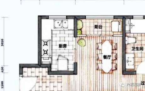 而龙湖天宸原著这款户型,将厨房横了过来,令厨房、餐厅、客厅由南至北纵向布置。虽然餐厅失去了开窗,但却获得了几个好处: