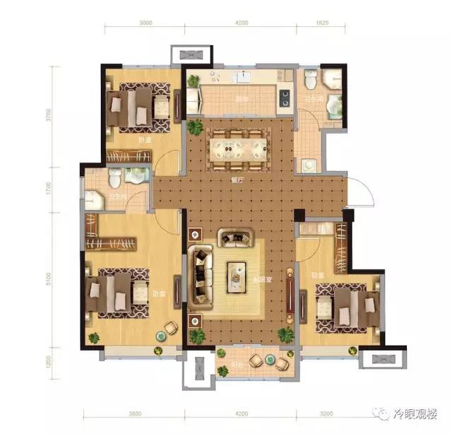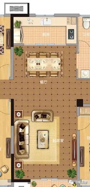 餐厅开间加大后,就可以将其作为一个交通中转,把其他功能区的门开向餐厅,中间摆上餐桌后,并不会影响人的同行。这样,就消灭了大走廊,减少了面积浪费。