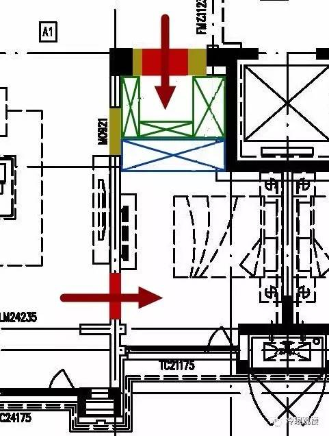 第一部分,南向次卧的门口,如果从客厅北侧标黄的区域,挪到南侧标红的区域,北侧电梯井旁的那部分拐把空间,正可以进一步利用。