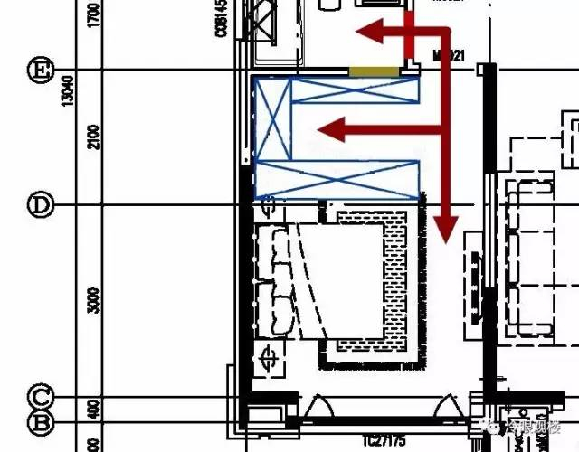 而开门的位置和南侧之间留下60度公分,这样,北向次卧的衣柜就可以再延长1米。(蓝色区域)