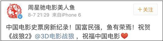 令人捧腹的是,周星驰电影美人鱼官方微博的管理员在7日晚上九点半时就提前发来贺电,庆祝中国电影票房新纪录。