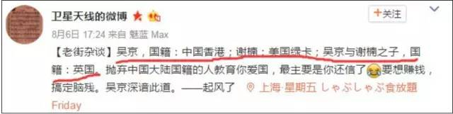 《战狼2》 引爆了暑期档,票房已过34亿,而此时网上传出一个言论:吴京是中国香港籍,妻子谢楠持有美国绿卡,其子是英国国籍,并借此嘲讽说:“抛弃中国大陆籍的人教育你爱国,你还信了?”
