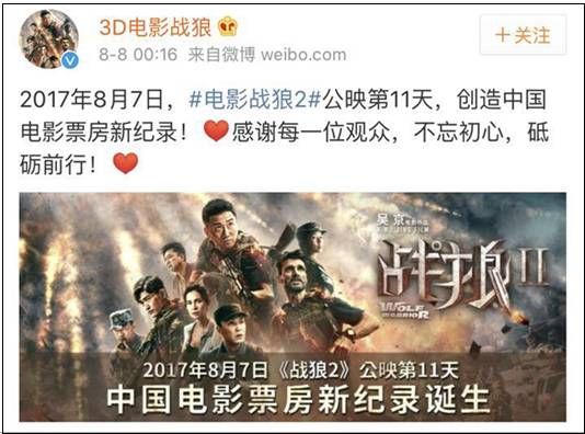 “中国电影史票房新纪录!国富民强,鱼有荣焉!祝贺《战狼2》@3D电影战狼 ,祝福中国电影