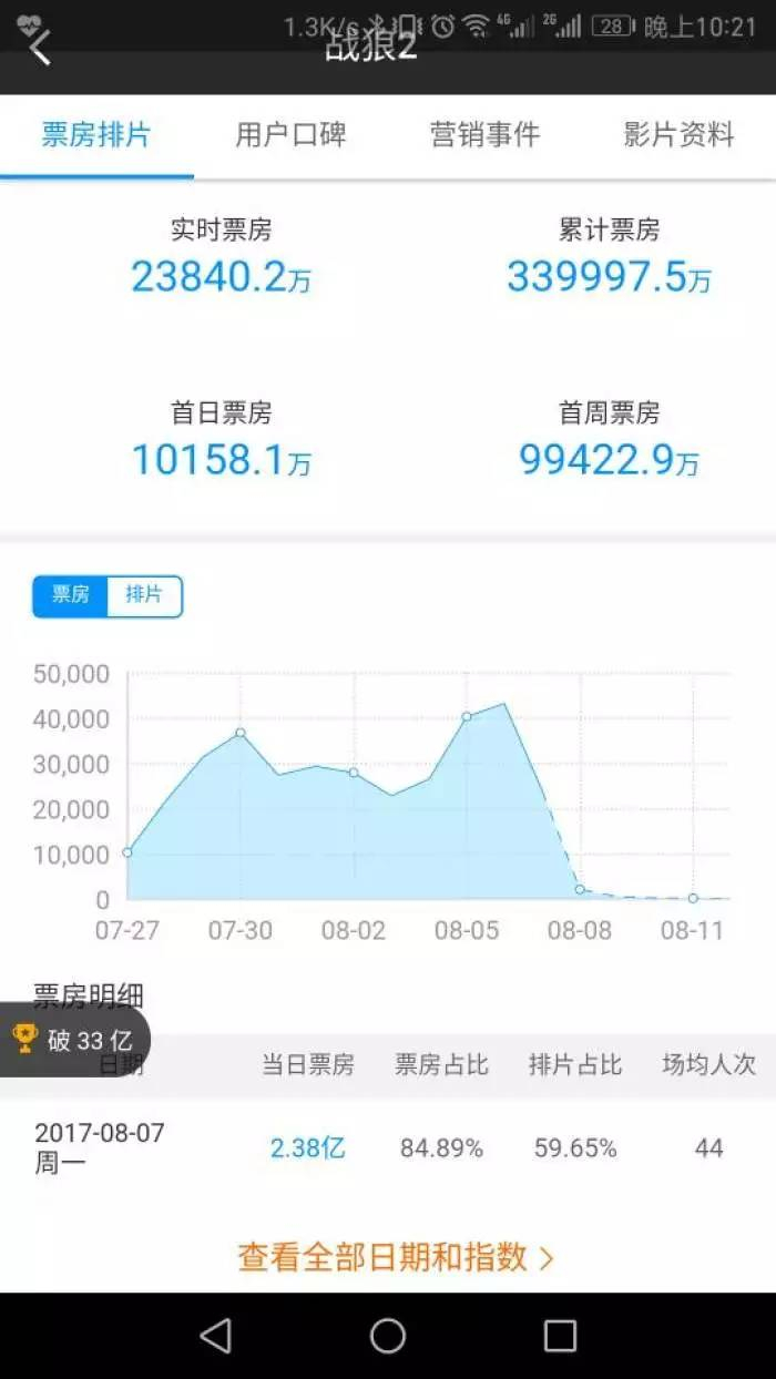 这应该是国产电影有史以来最爽的一刻。据格瓦拉实时票房统计,由吴京自导自演的《战狼2》至今已获得33.99亿票房,超过了周星驰执导的《美人鱼》(33.9亿),正式登顶中国电影票房冠军的宝座。