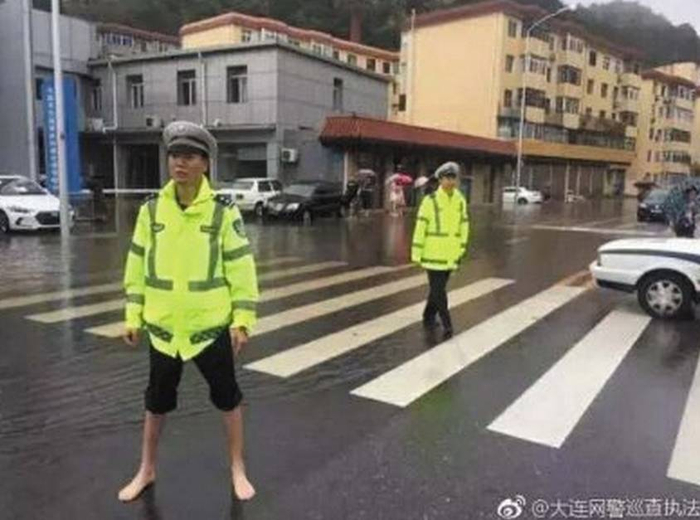 “光脚交警”水中指挥感动司机
