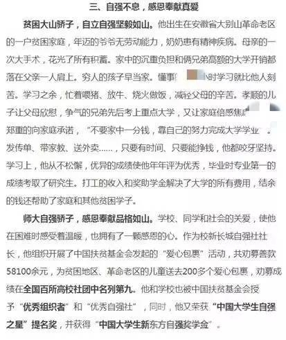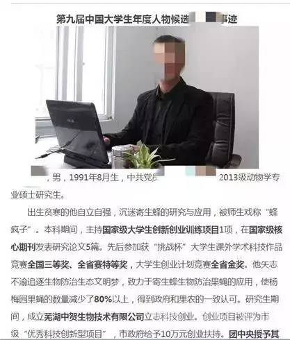 贺某出生于安徽一个农村家庭,大学本科期间,曾先后获得多项全国和省级的学术科技奖、创业奖,研究生期间,他成立了生物技术公司,得到数十万元的基金资助,并荣获中国大学生年度人物候选提名,以及中国大学生“自强之星”提名奖。