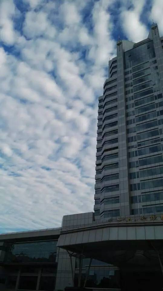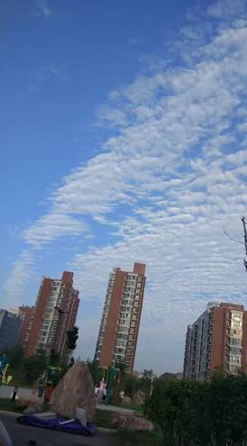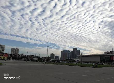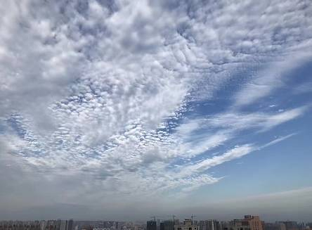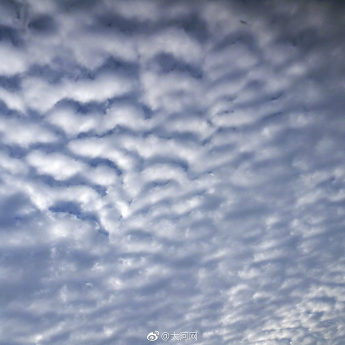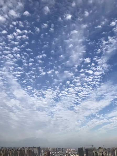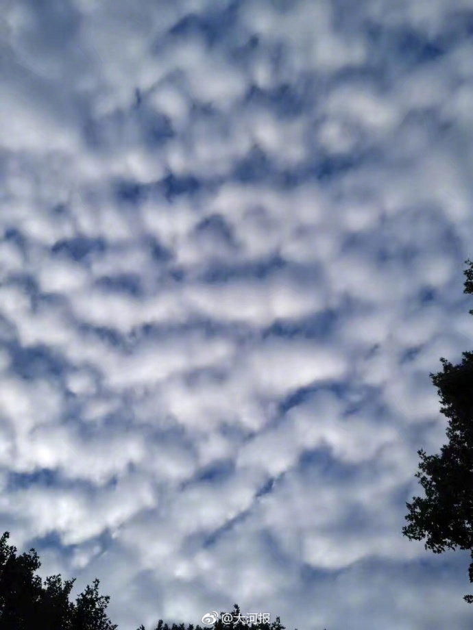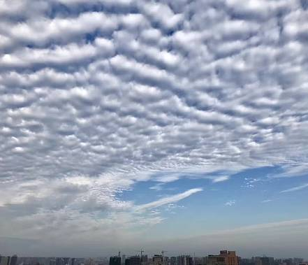 鲜明的色彩,蓝天与白云对比着;整齐的形状,风向与云块组合着。一层层,一排排,一块块,有人想起了老家的瓦房房顶,有人想起了过风或无风起浪的小河水面,有人想起天空浮泛的就是鱼肚白,其形如鲲鹏大小。