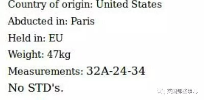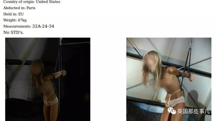 “这个女孩可以向全球发货,只要付款,我们有人可以安排运送。 欧洲内免费。出生在英国的模特,在意大利绑架,目前关押在德国,19岁,白人,34DD-25-35。 拍卖日期:2017年7月16日”