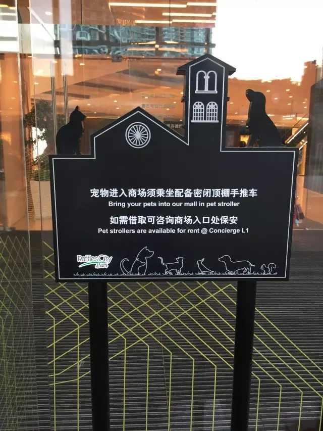 “顾客可以带宠物进入。在商场的大门口还竖立了一块招牌,上面写着‘宠物进入商场须乘坐配备密闭顶棚手推车。’