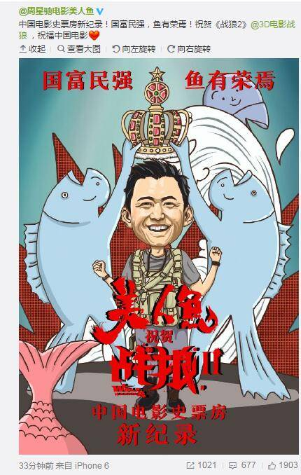 令人捧腹的是,周星驰电影美人鱼官方微博的管理员在晚上九点半时就提前祝贺《战狼2》的登顶,感觉他们的小编已经按捺不住下班的心情了……
