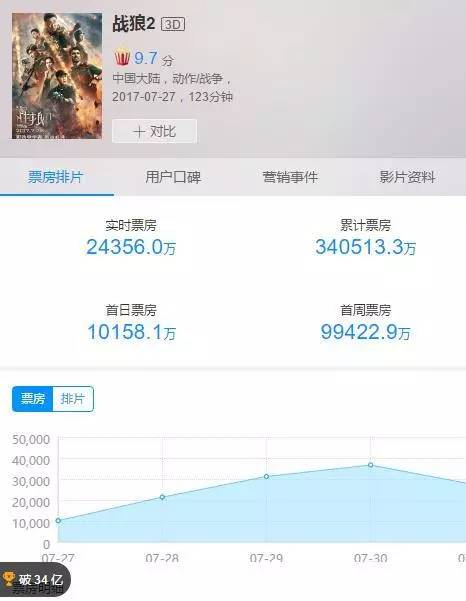《战狼2》一路狂奔的电影票房仍未停止。据微影数据,截至7日晚23:40时,《战狼2》的实时票房已超34亿元 ,超过之前国产片票房冠军《美人鱼》33.92亿元票房,成为最新国产票房当之无愧的“老大”。