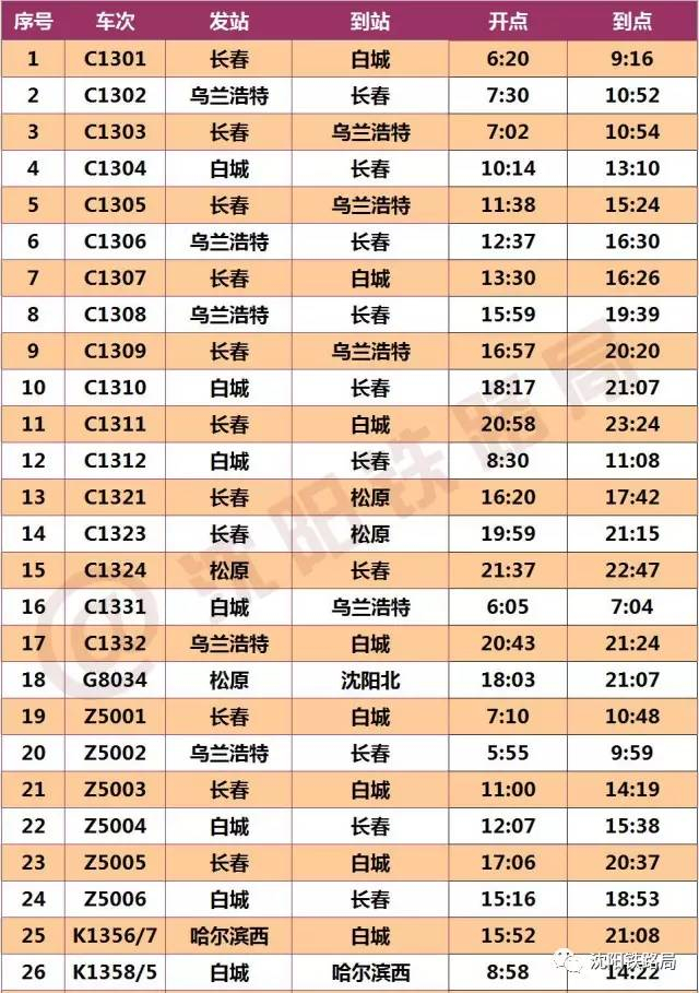 长春~白城Z5001/04、Z5003次、Z5005/6次;乌兰浩特~长春Z5002次等普速列车自8月8日起开行。