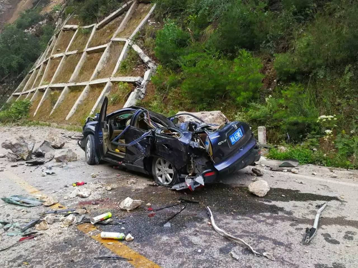 四川移动阿坝分公司副总经理徐凯旋告诉中国青年报·中青在线记者,今晨阿坝公司在省道301关门子至九寨沟沟口路段徒步进入灾区时发现,沿路垮塌方量很大,沿路被砸车辆众多,地面现明显裂缝,车辆无法通行。(供图 四川移动阿坝公司徐凯旋)
