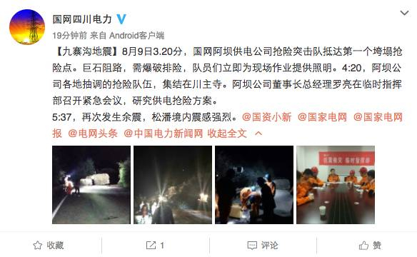 国家电网电力抢险救援队伍携带动中通、无人机等装备于昨日23:56从成都出发,赶赴灾区开展应急通信保障、灾情侦察等工作。
