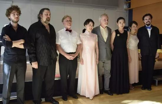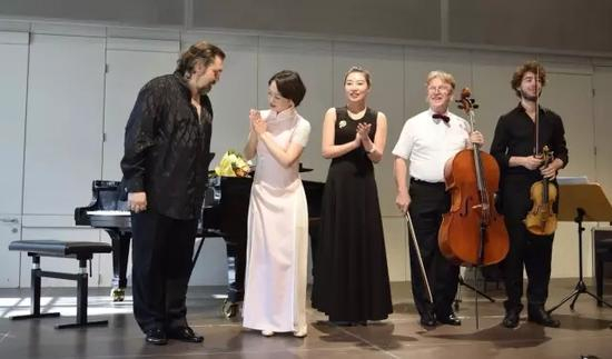 俄罗斯著名钢琴家Timur Sergeyenia(左一),英国大提琴家Mark Graveson(右三)和法国小提琴家Igor Pollet(右一)与昆曲“传”字辈第三代传人周好璐(左二)同台演出。