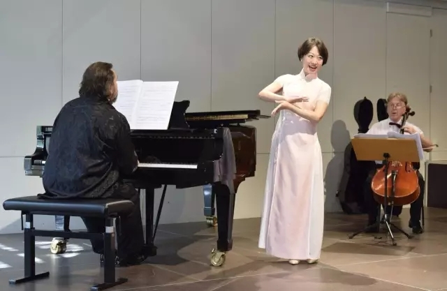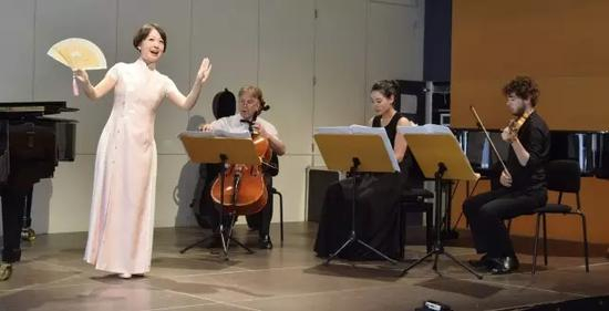 “但愿那月落重生灯再红……”,只一袭饰有昆曲戏服元素的旗袍洋装,一把折扇,昆曲“传”字辈第三代传人周好璐,8月4日下午,在俄罗斯著名钢琴家Timur Sergeyenia,英国大提琴家Mark Graveson,和法国小提琴家Igor Pollet的伴奏下,于有着近两百年历史的国立维也纳音乐与表演艺术大学海顿厅,上演了新版昆曲《牡丹亭·游园惊梦——为人声、钢琴、小提琴与大提琴而作》。这是中国青年作曲家林莫樵应比利时作曲家、贝多芬第五代嫡系弟子彼得利兹的邀请,携其新作——新版昆曲《牡丹亭》参加“维也纳国际音乐大赛”的特邀展演。中国驻奥地利大使馆文化处李克辛参赞、维也纳京剧社社长宋健等旅奥华人华侨音乐和戏剧爱好者观看了演出。